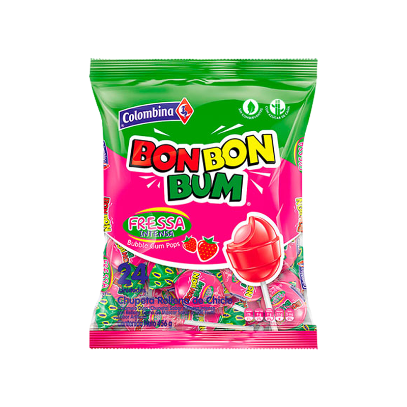 Bonbonbum de fresa en empaque por unidades domicilio, bombombum de fresa marca colombina economico, bonbombum surtidos sabores
